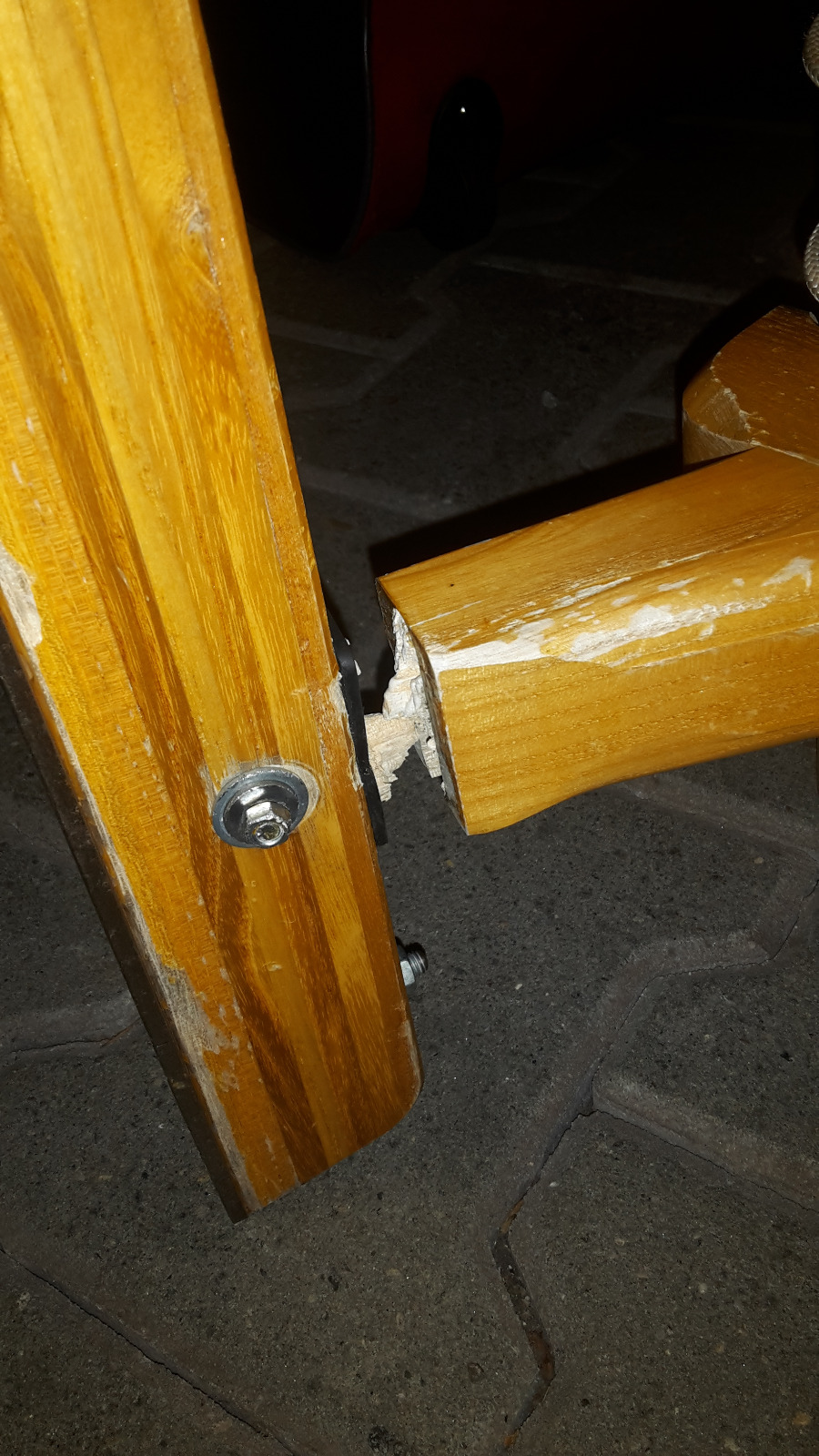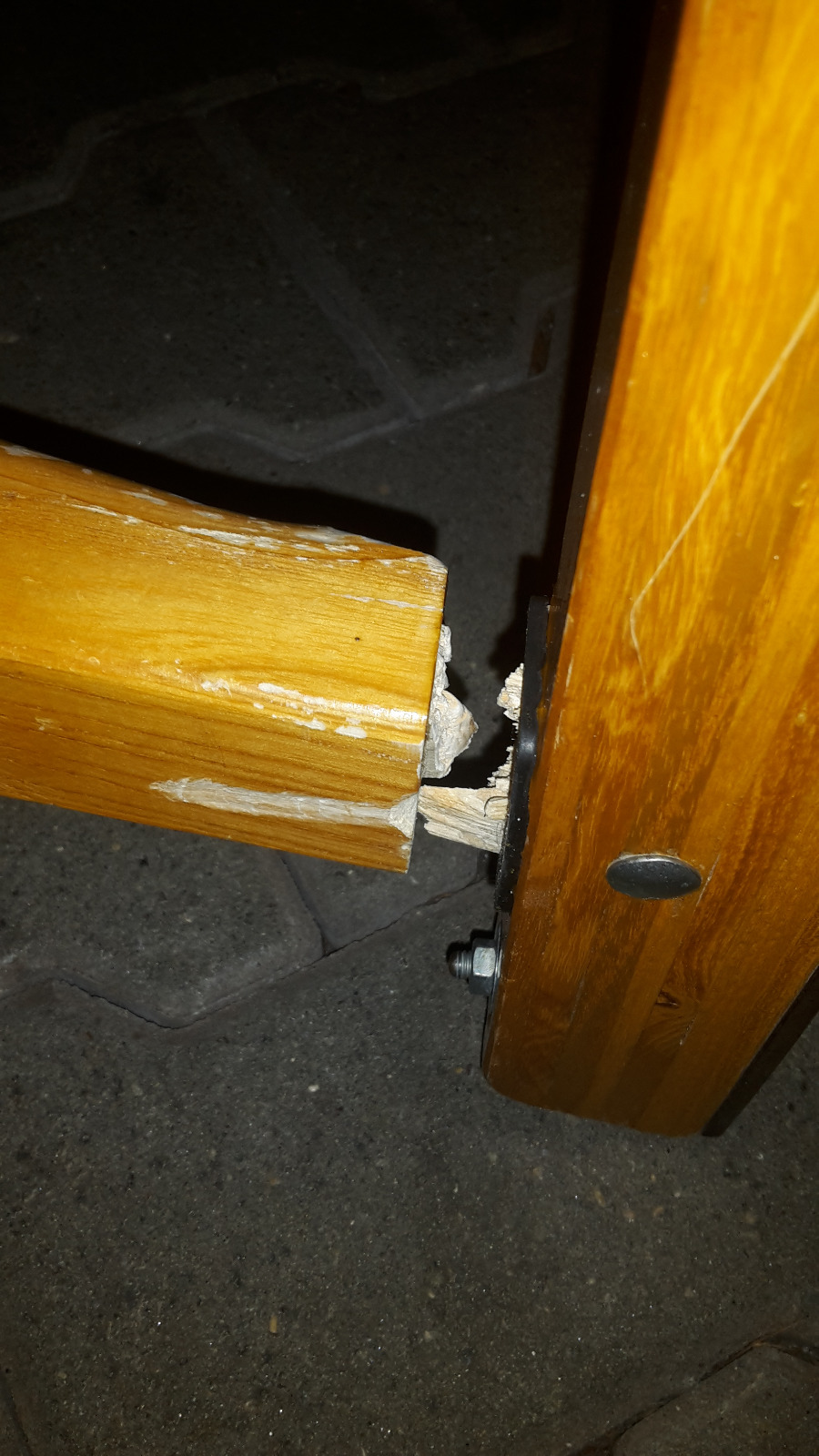 ein weiteres problem habe ich allerdings auch noch dabei entdeckt: eine der 4 schrauben, die diese längs-holme an die bankerl festmachen, ist abgebrochen.