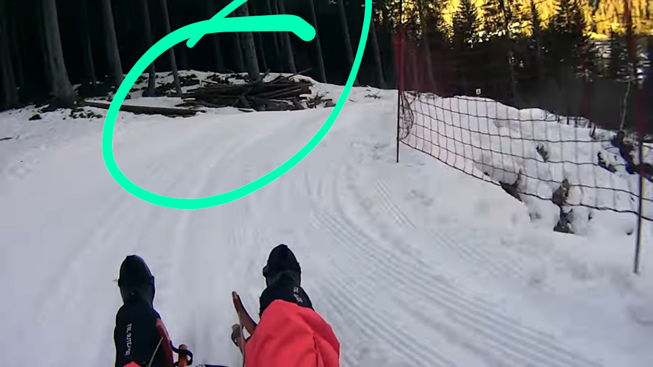 Ohne den Holzstoß war das bisher eine meiner Lieblingskurven in Ratschings. Durch die Achterbahncharakteristik und weil die Kurve aufmacht, gibt es mir diesen Kick ungebremst durchzufahren. Man muss aber auch bedenken, dass ich bei der vorherigen Linkskurve nach dem Tunnel auch gut abbremse, weil ich Schiß habe, dort in die Bretterwand auf der rechten Seite zu knallen.